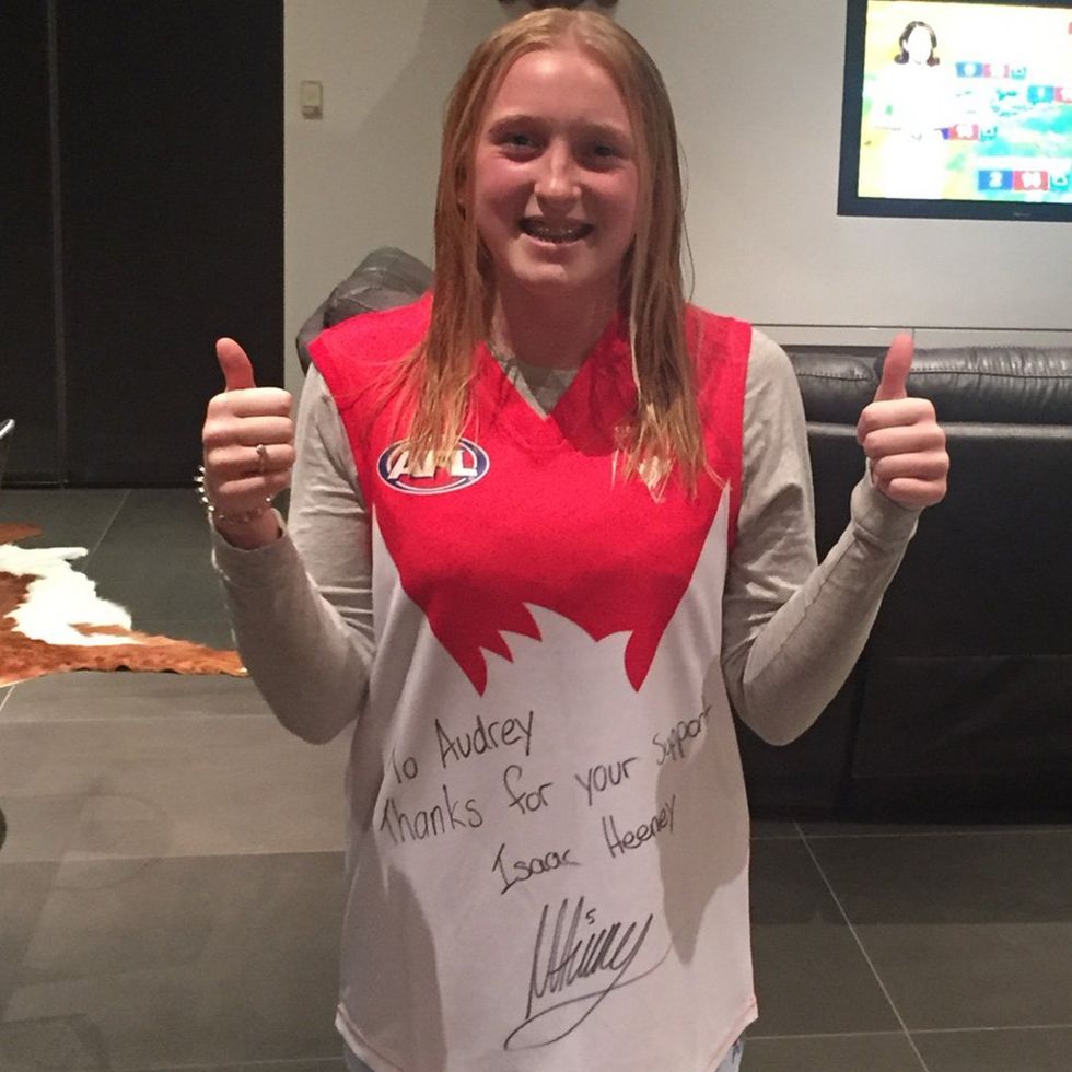 Audrey Barker in her prized Isaac Heeney-signed jersey.