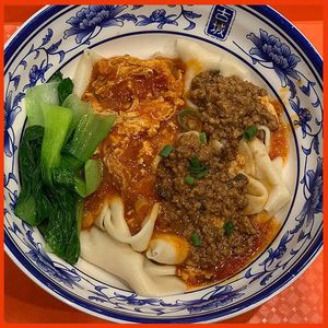 Like the Chongqing xiaomian, the plain chilli and vegetable-topped version of the Biangbiang noodles served in Haymarket's Biang! Biang! is vegan-friendly, but the recommended version for meat-eaters is the one with tomato and egg plus pork gravy. The noodles are hand-pulled, thick, as wide as a belt and exceptionally chewy. They are made to be coated with the eclectic flavours of the toppings.