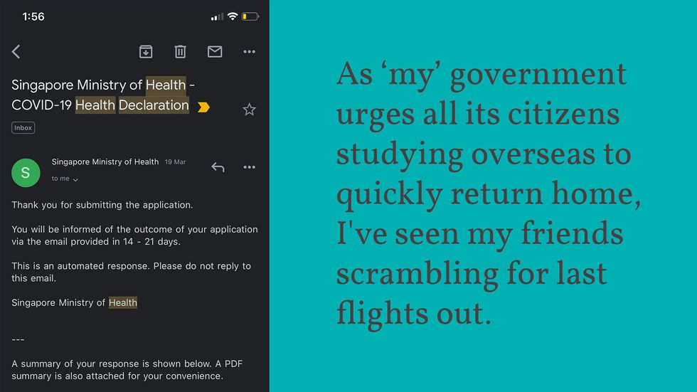At this point, I wish I could just go home to the comforts of my family. As "my" government urges all its citizens studying overseas to quickly return home, I've seen my friends scrambling for last flights before the airlines stop flying. This call to return home comes as the Singaporean government announces its own tighter border restrictions.