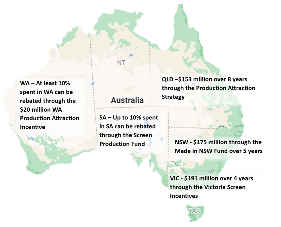Australia’s east coast has three major film studios: Village Roadshow Studios on the Gold Coast, Disney Studios in Sydney, and Docklands Studios in Melbourne. All these studios benefit from the Federal Government’s location incentives for studios to film in Australia, as well as competitive State government incentives. South Australia and Western Australia have also joined the incentives arms race, with similar locations grants making them just as competitive in getting the next Hollywood blockbuster. It's state against state.
