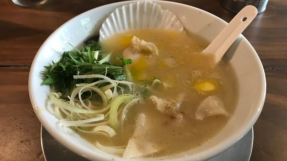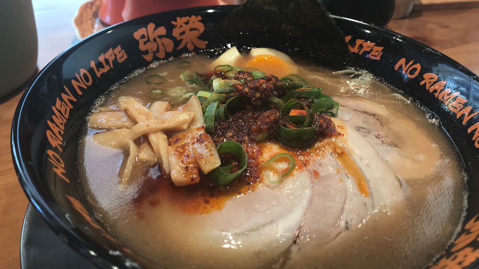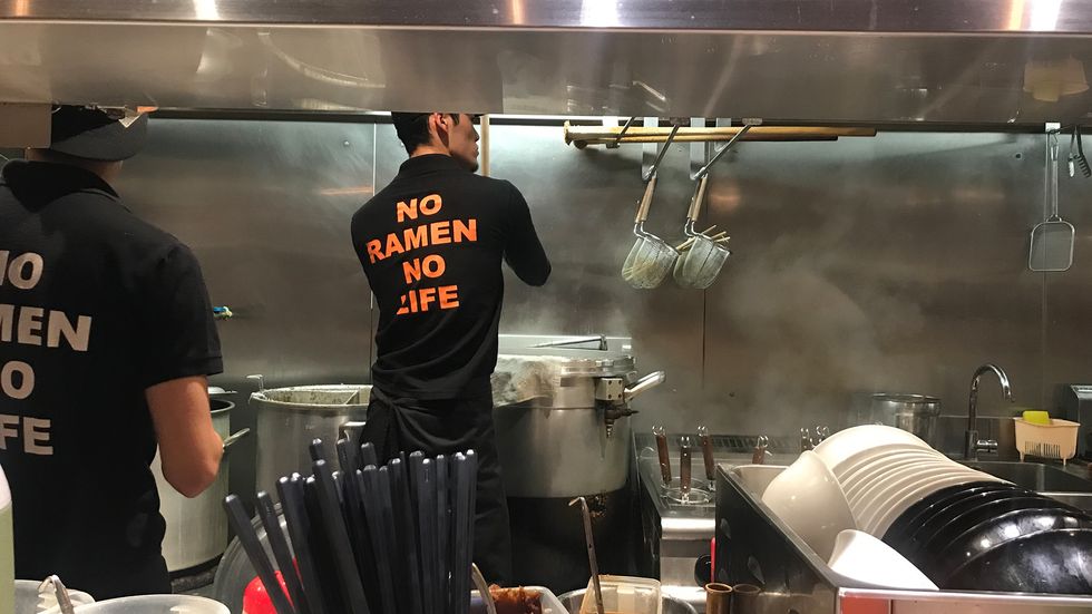 The restaurant is often busy, but the chefs, wearing shirts with "NO RAMEN NO LIFE" emblazoned across the back, are always chatting happily in Japanese, creating a joyful atmosphere.